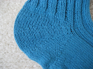 Another class sample. These are from Cat Bordhi's Sweet Tomato Heel book. I decided to make fraternal twin socks-same yarn, different pattern. The sock on the left is Simply Splendid Socks and on the right is Hidden Pocket. I used the e-book and made both from top down and found there was a lot of going back and forth between pages. I had a problem with the beginning of the Simple Splendid Sock as I think there is a mistake in the pattern, but never got a response from Cat Bordhi about it. Will I make this heel again? Probably not. One side looks good-the one on the picture, but the other side has holes at the turn. I did them over trying to follow suggestions on the Ravelry Forum, and the hole size decreased, but I still am not happy with them. The yarn is CoBaSi which has a little elastic in it.